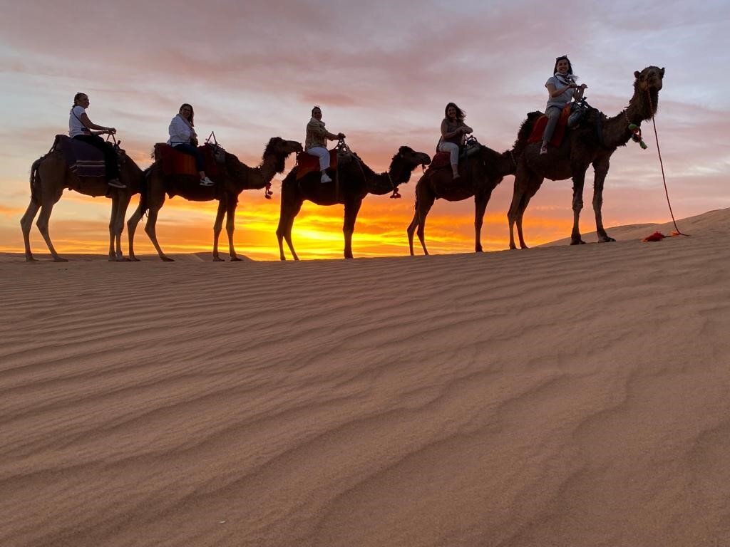 In the afternoon, enjoy a camel trek across the golden sand dunes to reach your desert camp. Watch a magical Sahara sunset before enjoying a traditional Moroccan dinner, Berber music, and a night under the stars in a desert camp.